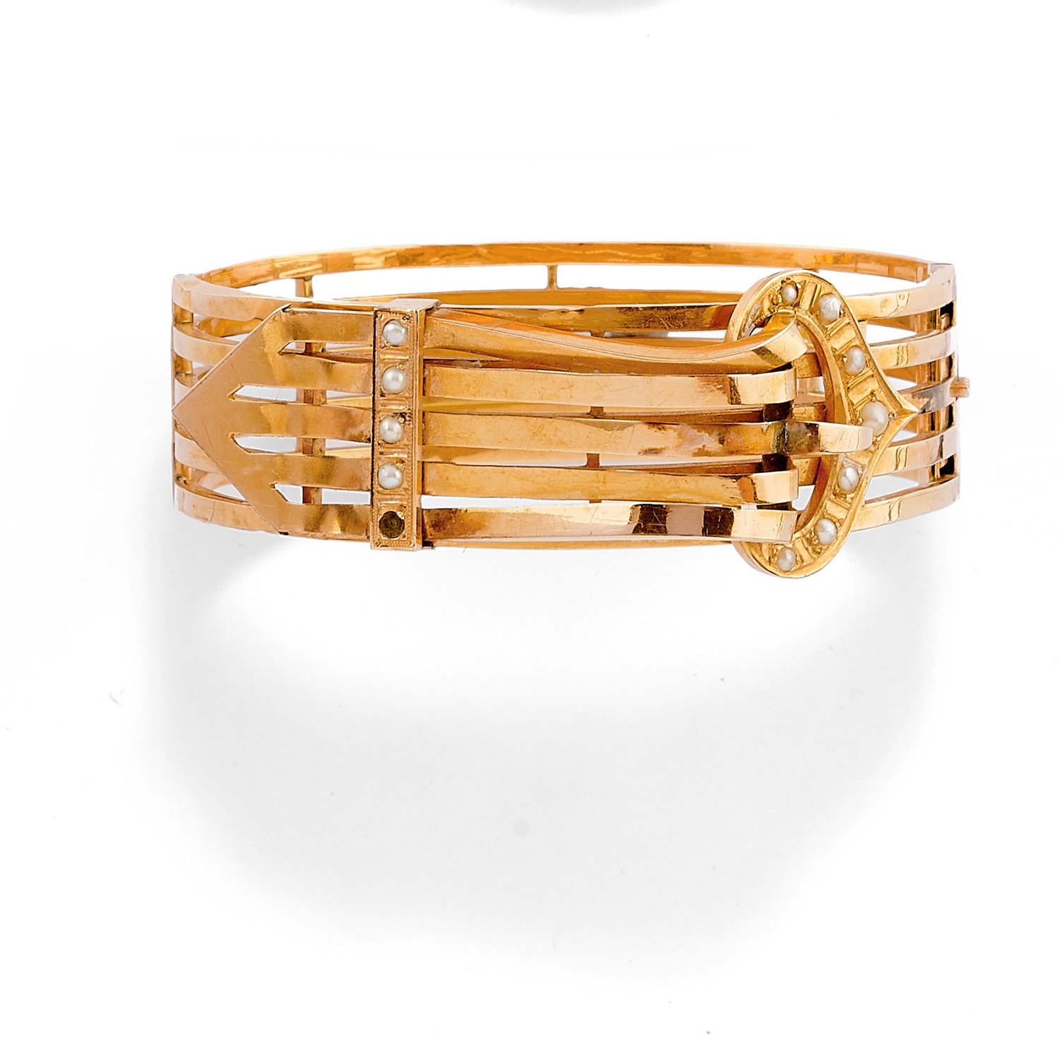 realizzato a fibbia, difetti (visibili ammaccature e una perla mancante).