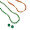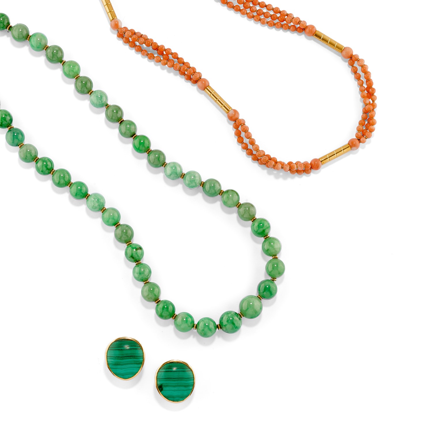 giadeite, malachite e corallo, composto da due collane e una coppia di orecchini.