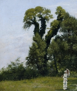 SCUOLA NAPOLETANA XIX SECOLO “Figura nel bosco” Olio su tela cm. 39x33 Piccolissama incisione di mm. 1 ca al centro.