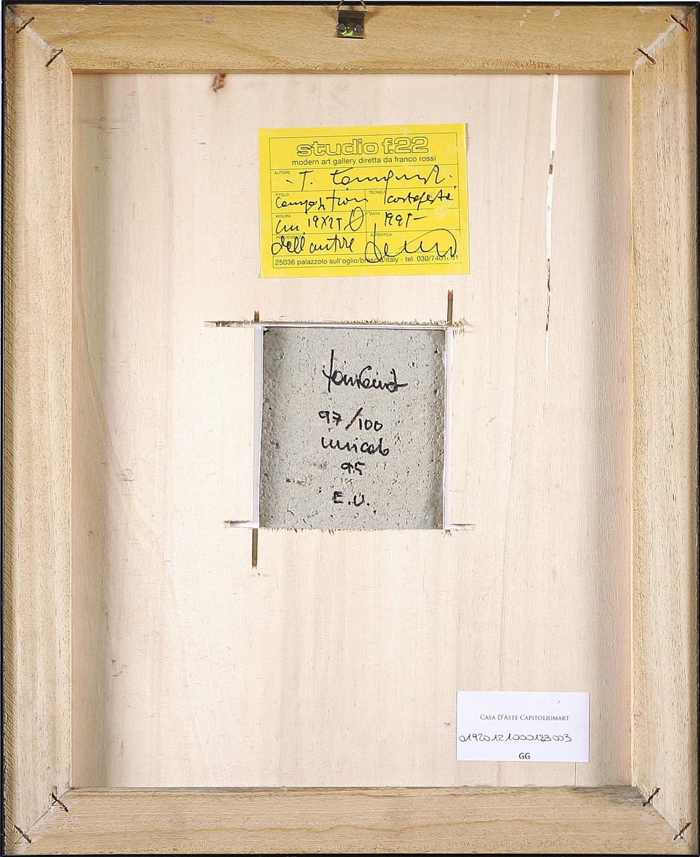 TORNQUIST JORRIT (n. 1938) Composition, 1995. cartapesta. Cm 19x25. Opera eseguita ad acrilico su cartapesta. Esemplare unico, come segnalato dall'autore al retro, da un'edizione di 100 (E.U. 97/100). Al retro cartiglio dello Studio F.22 di Palazzolo S.O., Brescia; firma, anno e dettagli dell'edizione.