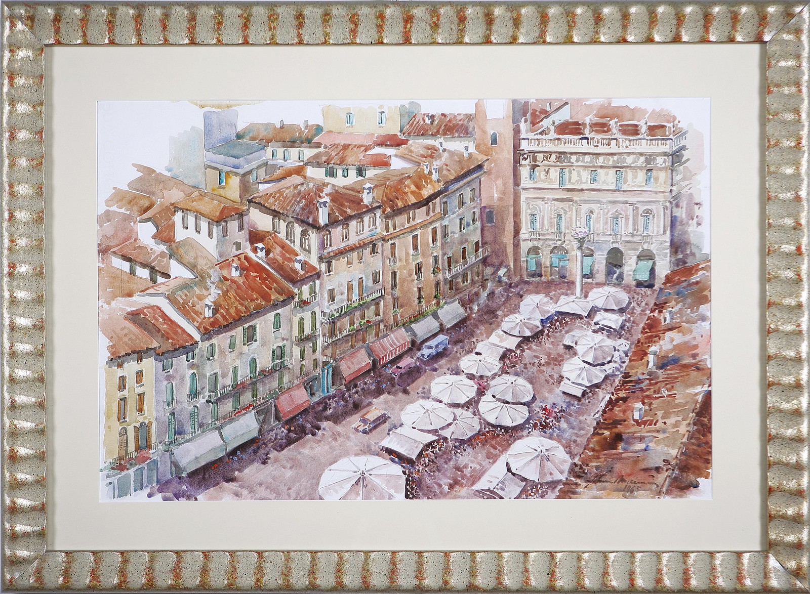 MAIRANI ALDO Giorno di mercato in Piazza Delle Erbe, 1965. Acquarello su carta. Cm 50x70. Firma e data in basso a destra. Al retro titolo, anno e firma.