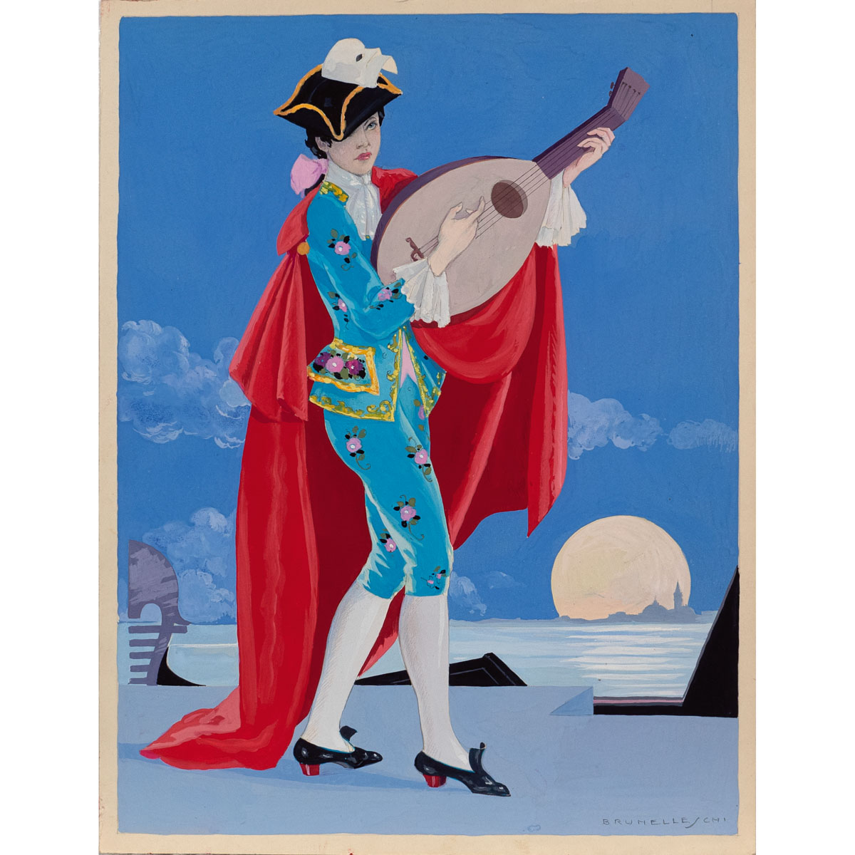 "Figura in costume veneziano con mandolino", gouache su carta, firmata in basso a destra