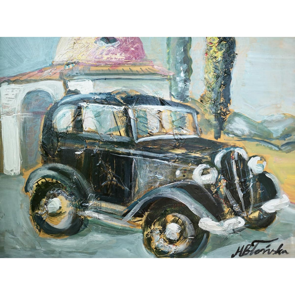 Margherita Blonska Polonia 1961 90x80 cm. "Vintage Car with the Chappel",...
