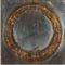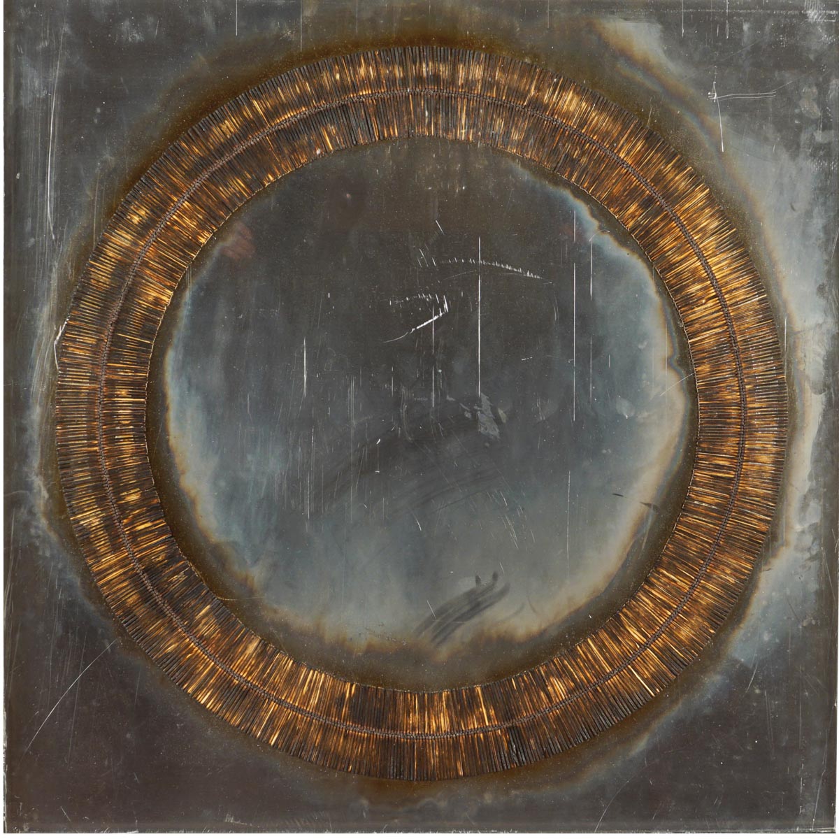 "Dessin de Feu circulaire", 1973, fiammiferi bruciati su lastra di metallo, entro cornice.
