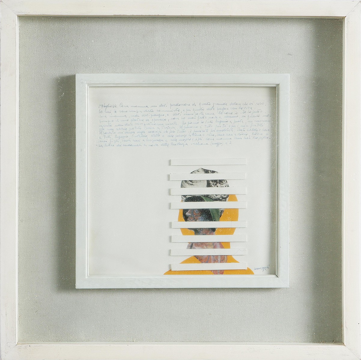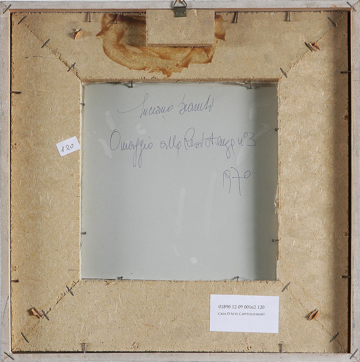 BIANCHI LUCIANO (n. 1935) Omaggio alla resistenza n.3, 1970. Tecnica mista su cartone. Cm 20x20,5. Firma e data in basso a destra, dedica in alto. Al retro titolo, firma e data.