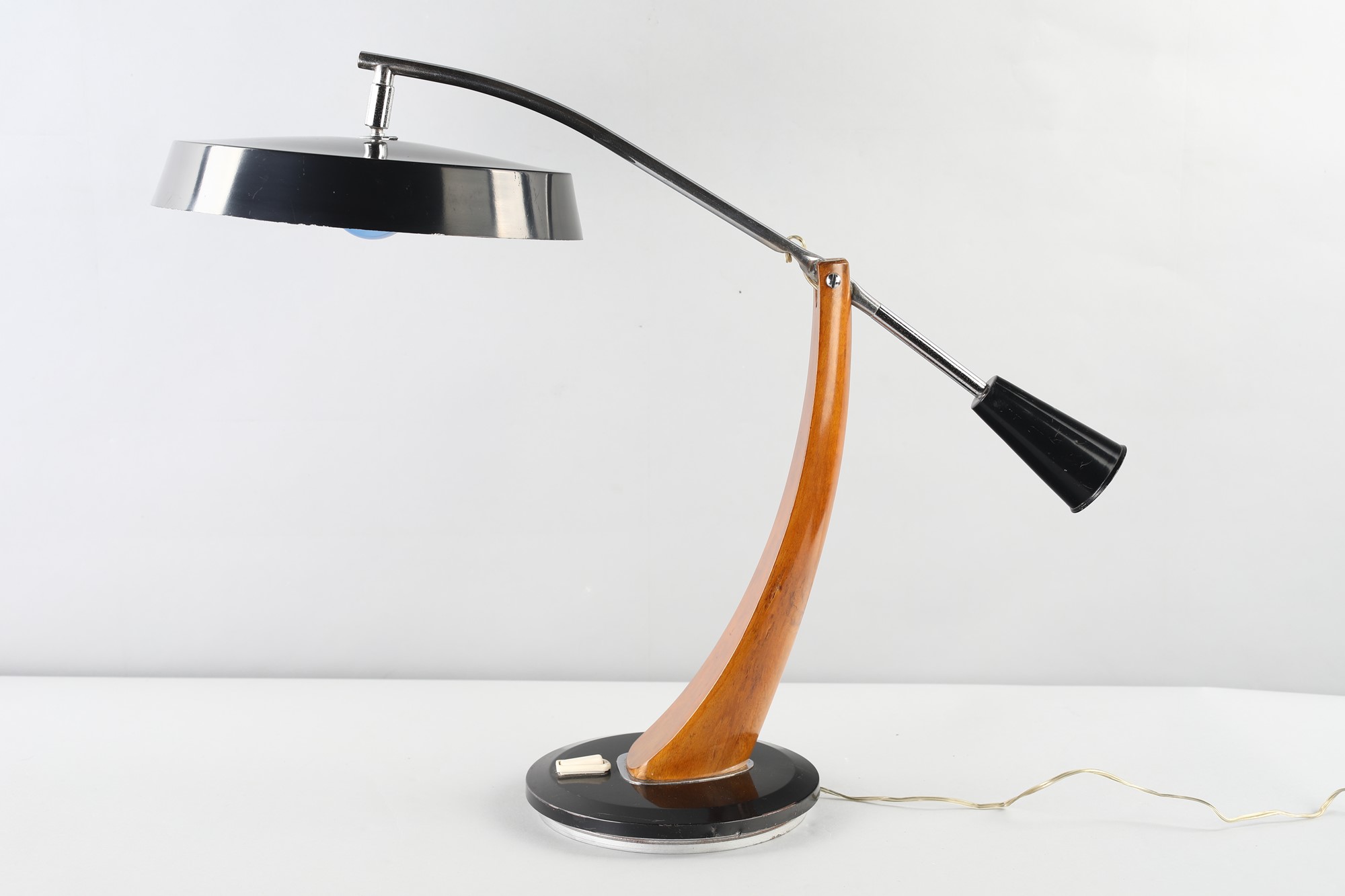 Lampada da tavolo - "President" braccio in legno orientabile dettagli e diffusore in metallo laccato nero - 1950 - PRODUZIONE SPAGNOLA, FASE - cm58x20