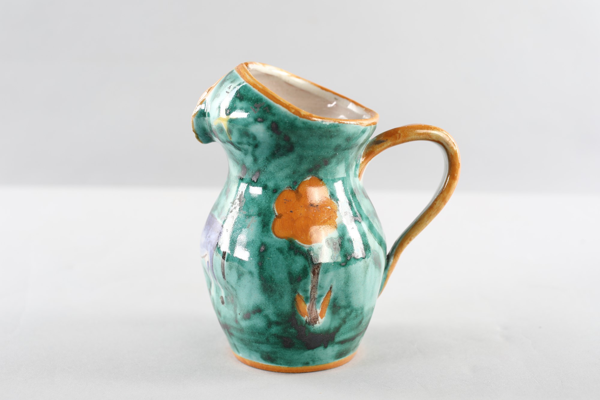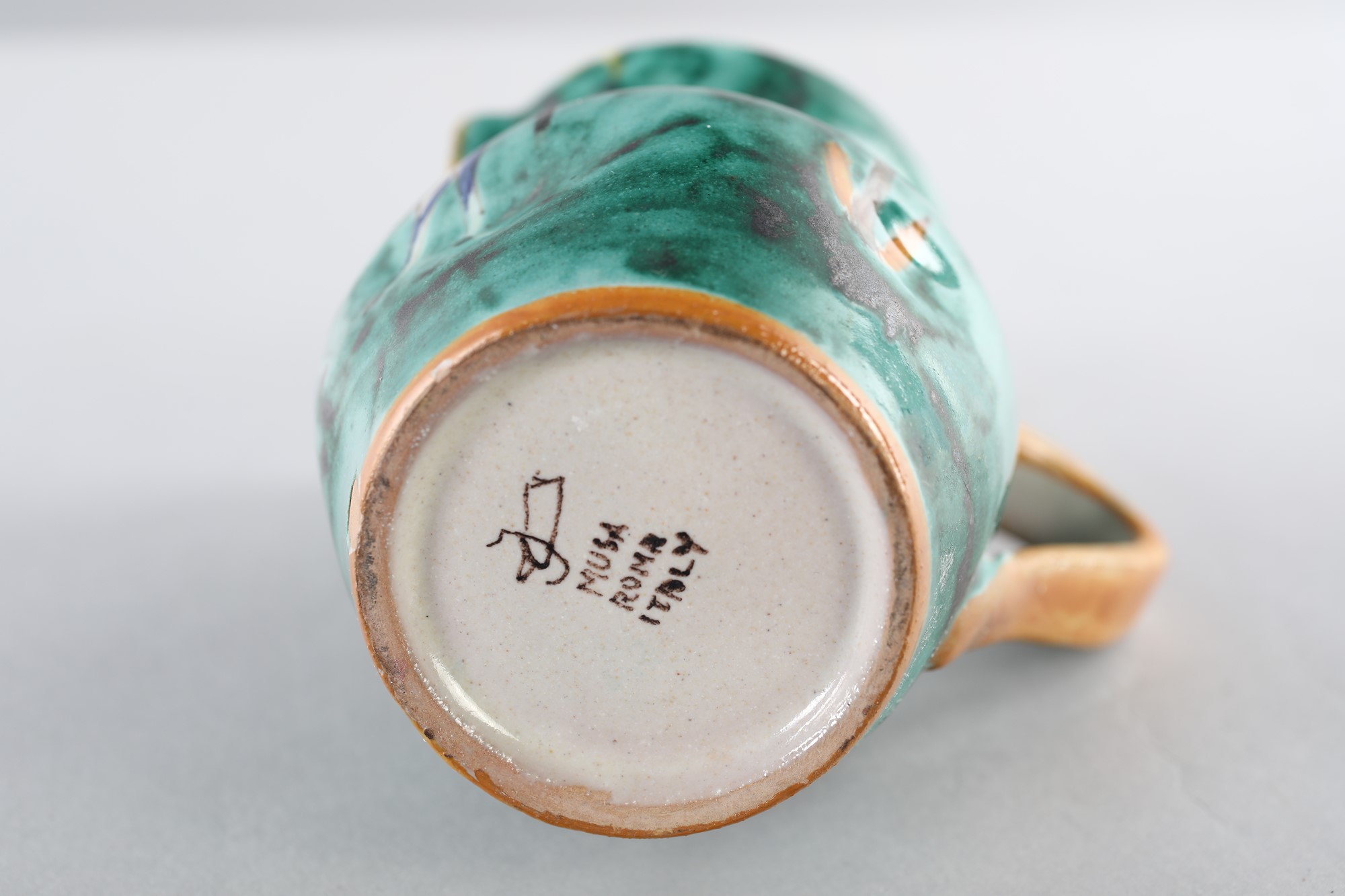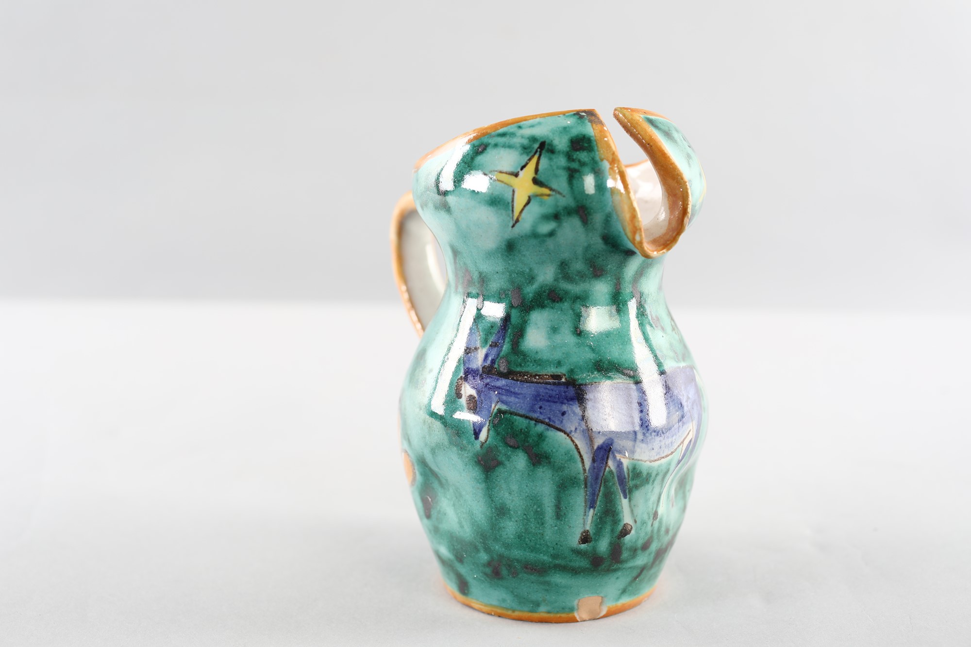 Brocca - in terracotta ingobbiata e smaltata con decoro asinello . Reca sigla sotto la base . 1950 - MUSA Roma - cm14x7