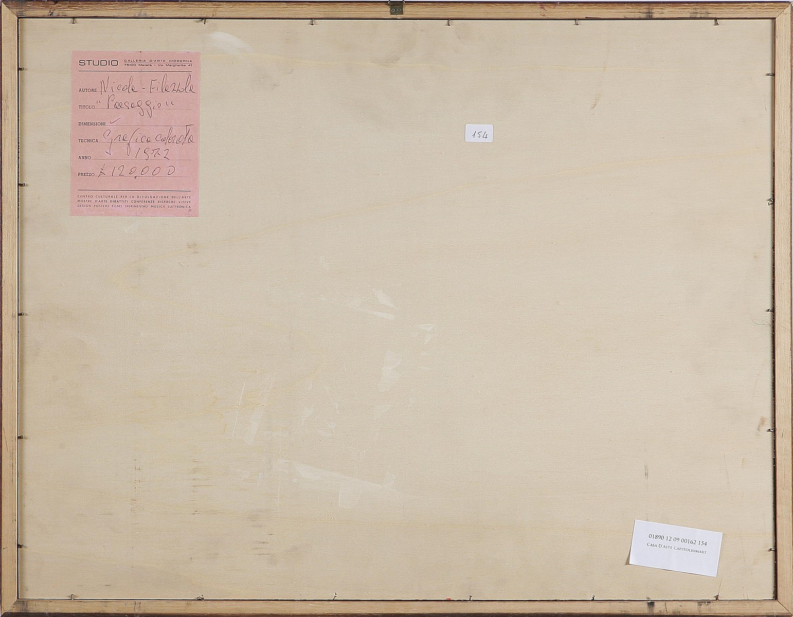 FILAZZOLA NICOLA (n. 1961) Paesaggio, 1972. Tecnica mista su carta. Cm 34x48. Firma e data in basso a destra. Al retro cartiglio descrittivo della Galleria d'Arte Moderna -Studio-, Matera.