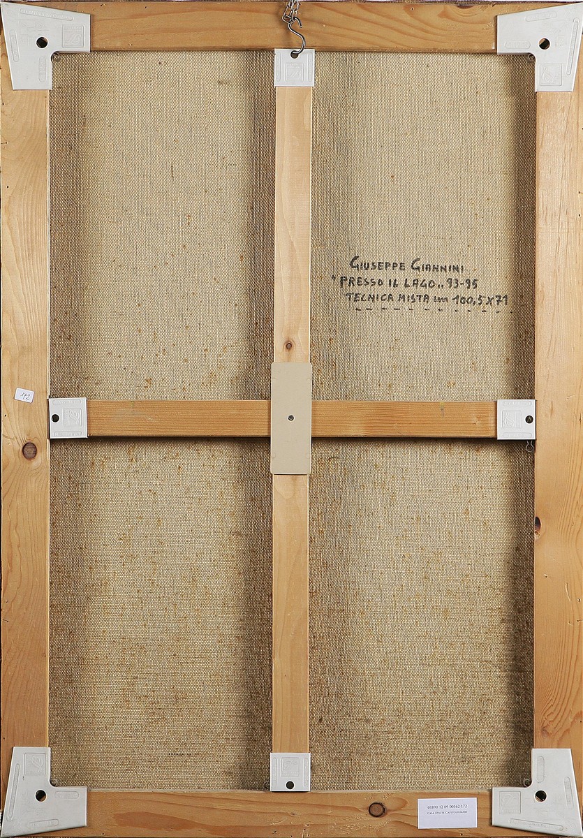 GIANNINI GIUSEPPE (1937 - 2012) Presso il lago, 1995. Tecnica mista su carta su tela. Cm 100,5x71. Firma e data in basso a sinistra. Al retro firma, titolo, misure e data.