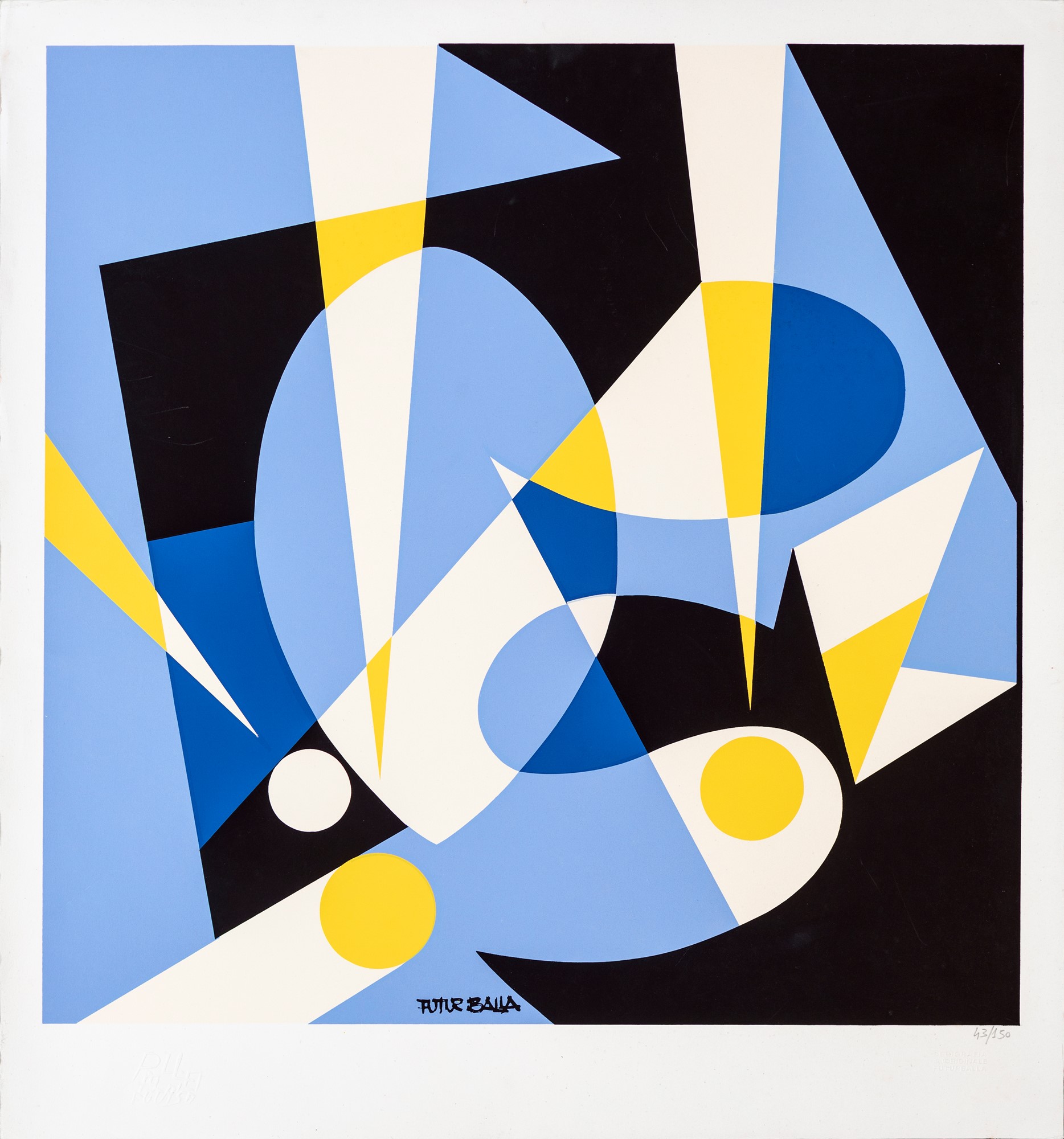 Numerata sul fronte 43/150. Reca timbri "Balla Futurista" e "Serigrafia dall'originale Futurballa".