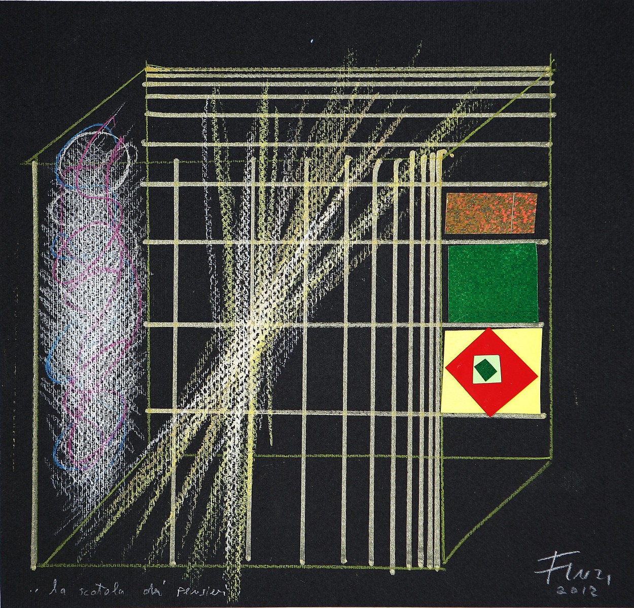 FINZI ENNIO (n. 1931) La scatola dei pensieri, 2012. Tecnica mista e collage su cartoncino. Cm 33x35. Autentica dell'artista su fotografia. Firma e data in basso a destra, titolo in basso a sinistra.