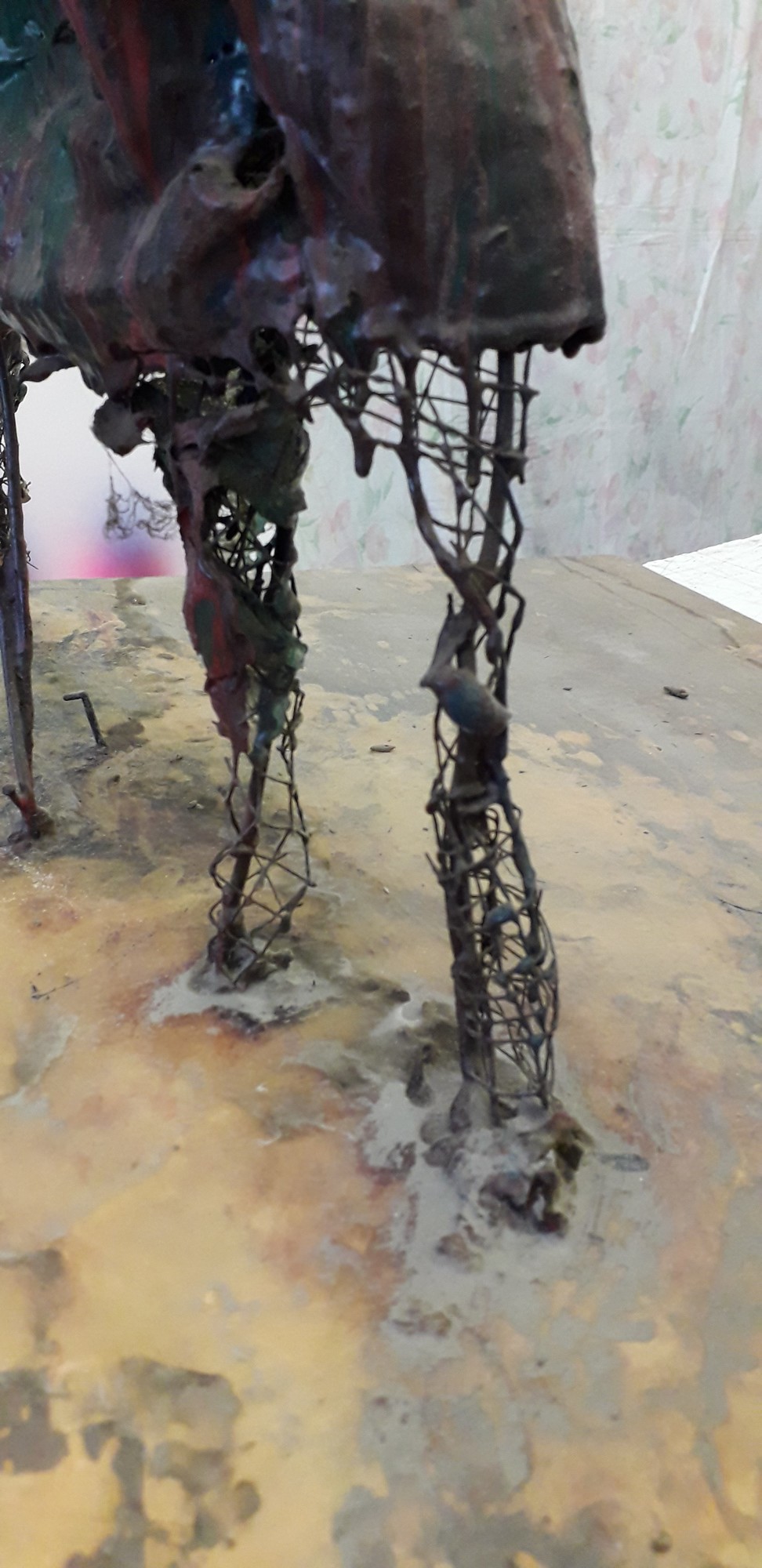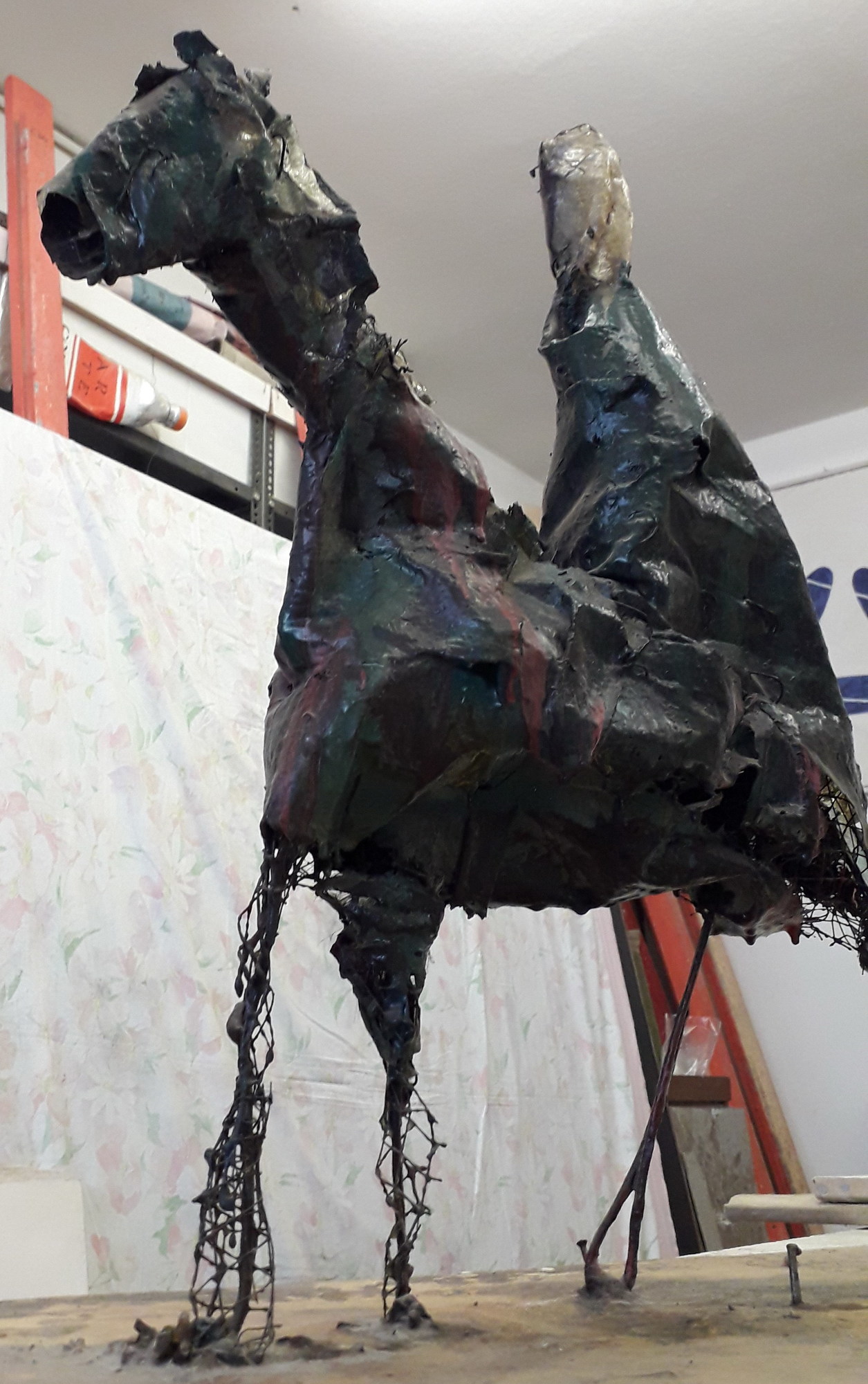 Scultura in metallo dipinta, applicata su base di legno.