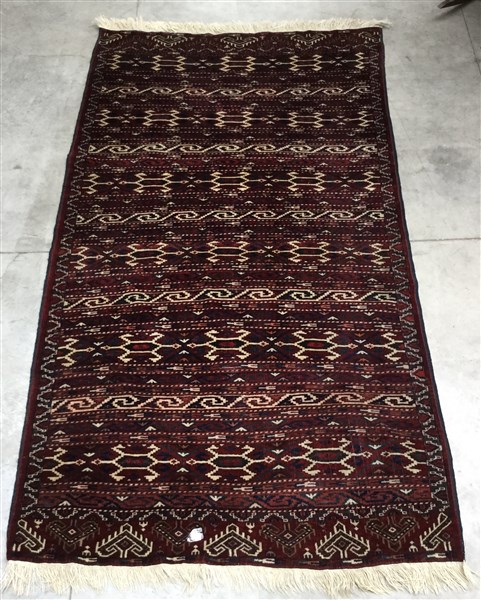 Decoro a fasce con motivi turkomanni su fondo bordeaux. (cm 244x141) (lievi difetti)