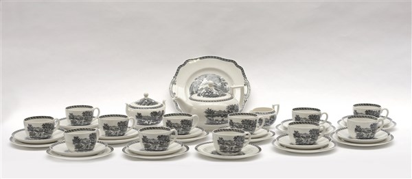Manifattura di Wedgwood, parte di servizio in porcellana decorata in monocromia a paesaggi composto da: teiera, zuccheriera, lattiera, dodici tazze con undici piattini, dodici piattini da dolce e un piatto sagomato (difetti)