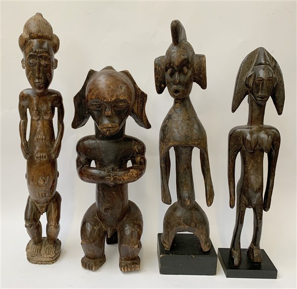 Arte africana, lotto di quattro figure in legno scolpito, misure diverse (difet