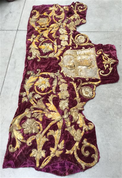 Testata di letto composto da ricamo in filo metallico riportati su velluto di seta color prugna. Stemma araldico al centro.(difetti e rapature) (cm 180x85)