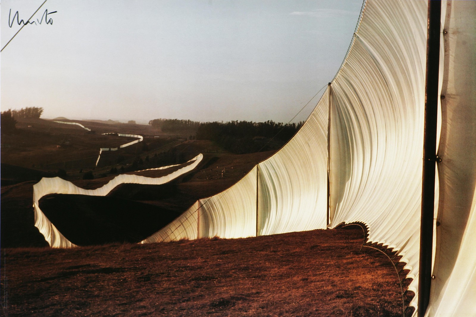 CHRISTO (n. 1935) Running Fence, Sonoma and Marin Counties, 1976. Poster. Cm 64x96. California, 1972-76. Firma in alto a sinistra; titolo e data stampati in basso a sinistra.