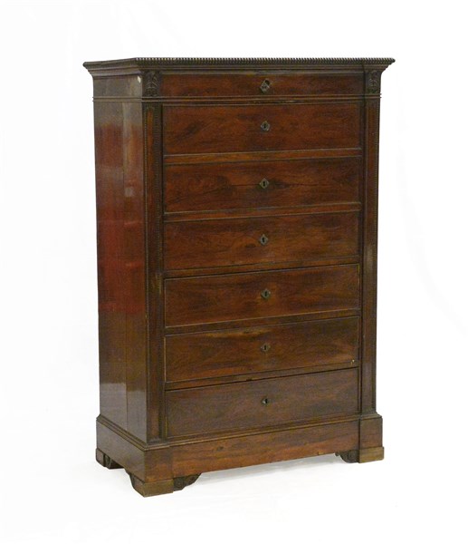 Secretaire a quattro cassetti e anta ribaltabile celante vani e cassettini, montanti intagliati all'attacco a volute. Secolo XIX (cm 96x142x47) (difetti)