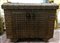 Cassone in legno con coperchio curvo, fronte rivestito in metallo decorato a mo