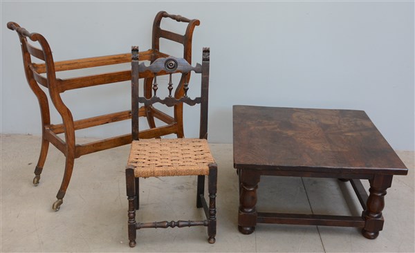 Lotto composto da un tavolino da salotto quadrato, una sedia con seduta impagliata e un carrello portavivande mancante dei ripiani (difetti e mancanze)