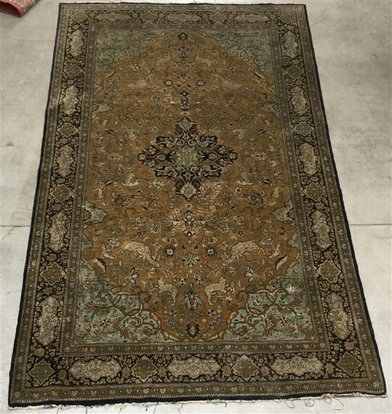 Annodato in seta su trame ordite in seta. Decoro con piccolo medaglione blu su fondo giallo ed oro ornato da animali e rami fioriti. (cm 222x131)