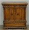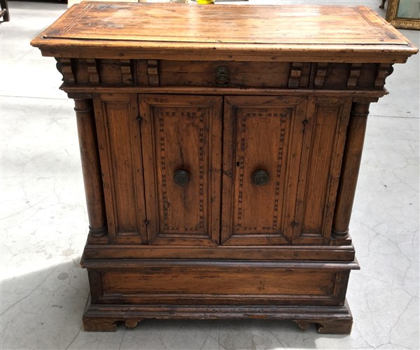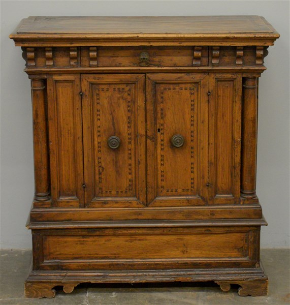 Credenzino in noce ad un cassetto e due ante riquadrate intarsiato a motivi geometrici, montanti a colonna. Secolo XVII (cm 90x94x45) (difetti e restauri)