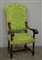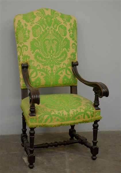 Antica poltrona in noce con braccioli mossi terminanti a ricciolo, gambe tornite, rivestimento in tessuto operato verde (difetti)