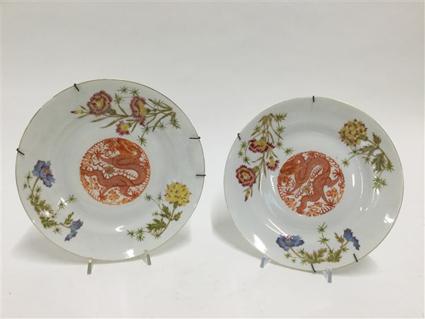 Coppia di piatti in porcellana con decorazione centrale a drago e fiori sulla t
