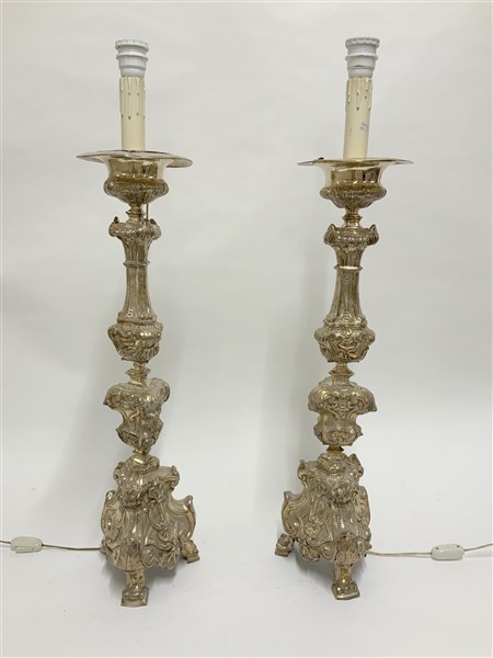 Coppia di portaceri tripodi in rame sbalzato a volute e fregi, montati a luce elettrica (h cm 70) (difetti)