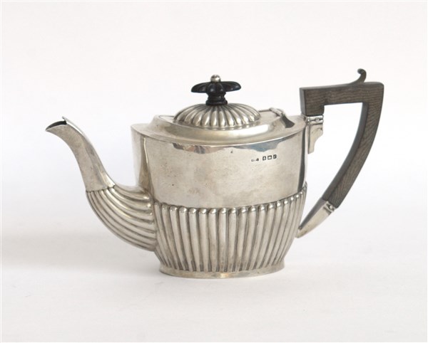 Teiera in argento con corpo scanalato, ansa e presa del coperchio in legno. Punzoni di Birmingham 1905. (gr 215 lordi)