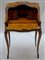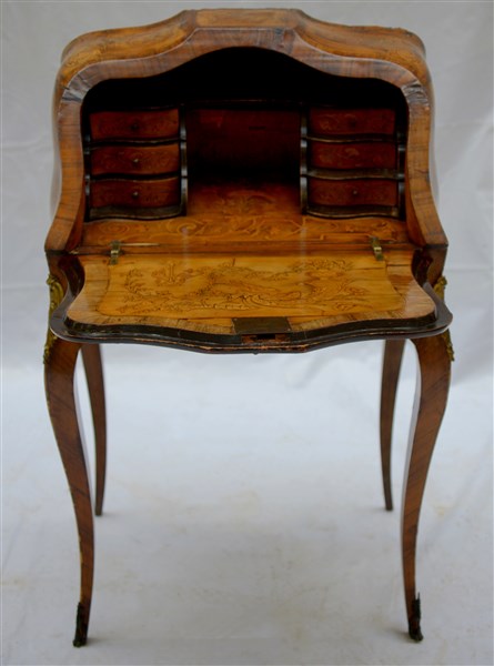 Piccolo scrittoio di forma mossa e bombata lastronato e filettato in legni vari