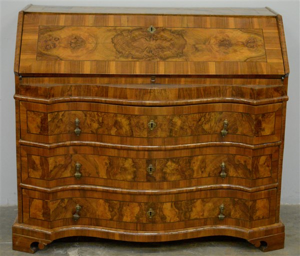 Ribalta lastronata in noce e radica di noce e filettata. Anta ribaltabile celante quattro cassetti e vano, fronte sagomato a tre cassetti, piedi a mensola, secolo XVIII (cm 118x104x62) (difetti e restauri)