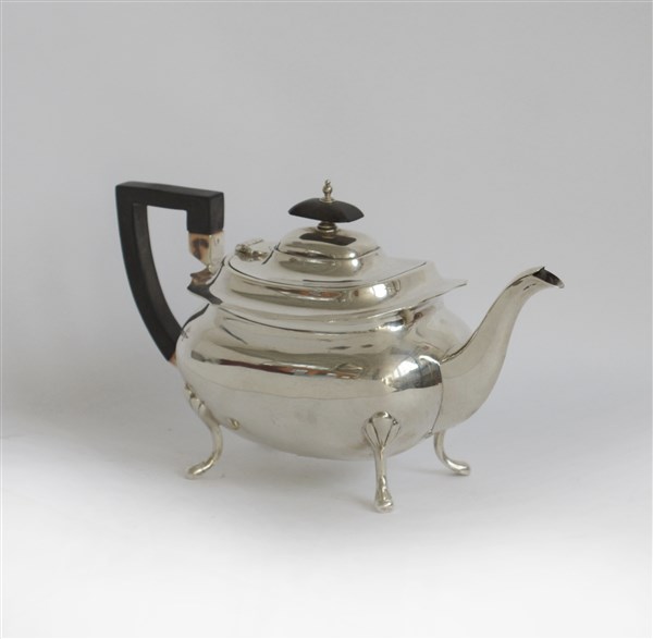 Teiera in argento a corpo liscio, piedini sagomati, ansa e presa del coperchio in legno, punzoni della Città di Sheffield 1913, argentiere Walker and Hall (gr lordi 760)