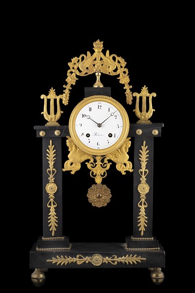 Orologio a portico in marmo nero del Belgio e inserti in bronzo dorato