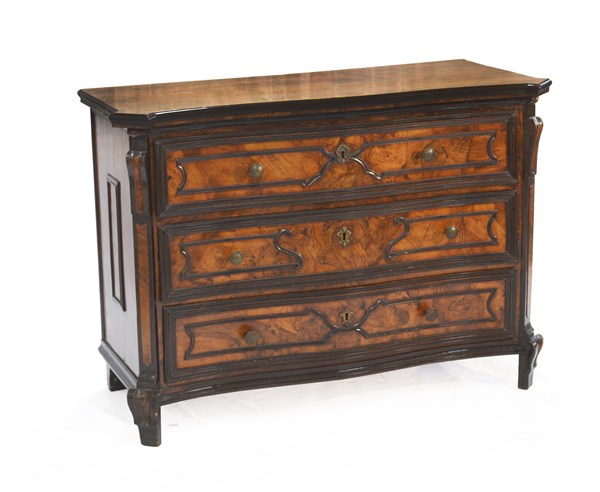 Cassettone in noce con fronte mosso a tre cassetti lastronati in radica di noce, riquadrati da sagme ebanizzate (cm 170x83x51) (difetti e restauri)