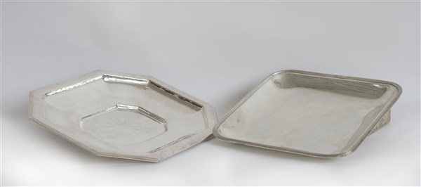 Lotto composto da un vassoio ottagonale in argento, argentiere Carlo Mozzoni Milano, ed uno quadrato con bordo scanalato argentiete Miracoli Milano (gr 2130)