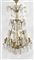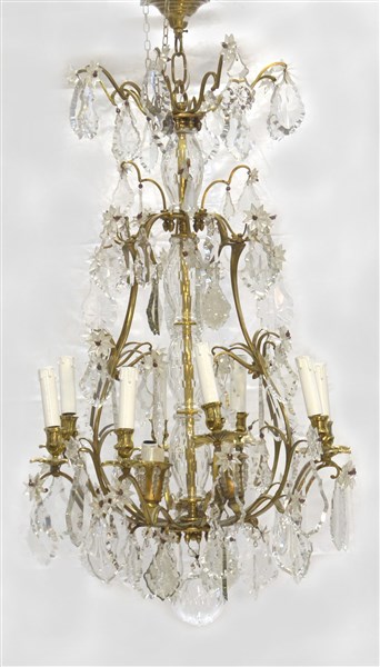 Lampadario a dodici luci con struttura in metallo dorato, pendenti e gocce in vetro (h cm 108) (difetti e mancanze)