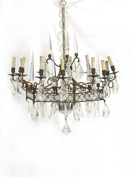 Lampadario di forma esagonale a dodici luci in metallo decorato con gocce e puntali in vetro (h cm 84 per d cm 70) (difetti e mancanze)