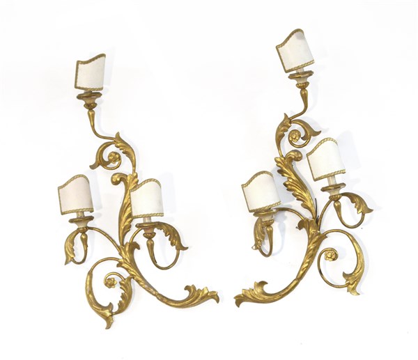 Coppia di appliques a tre fiamme in legno dorato e intagliato a volute fogliate e fiori, secolo XIX (h cm 85) (difetti)