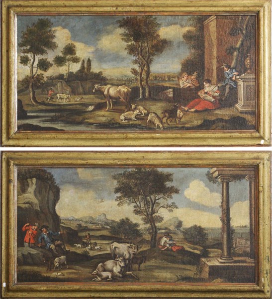 Ignoto "Scene pastorali" coppia di antichi dipinti ad olio su tela incollata su tavola (cm 50x102) In cornici (difetti e restauri)