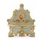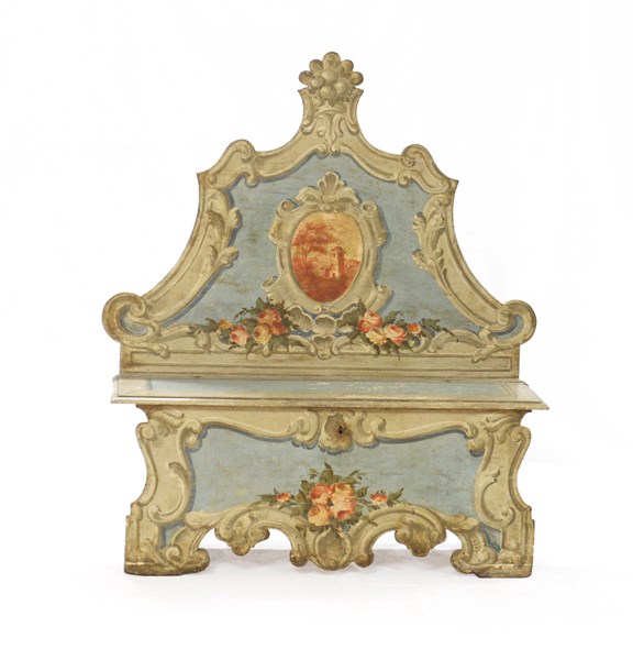 Antica panca con schienale sagomato interamente laccata a volute, cartigli, pae