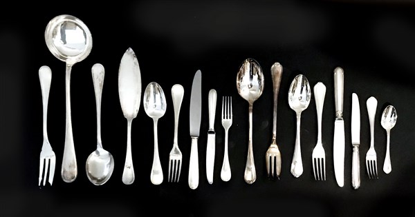 Christofle, lotto di due parti di servizio di posate: uno con manici decorati sul bordo a perlinature composto da 24 forchette, 12 coltelli e 12 cucchiai grandi, 12 forchette e 12 coltelli piccoli e 4 posate da portata; l'altro con manici decorati da nastro composto da 6 forchette, 6 coltelli e 6 cucchiai grandi, 6 forchette, 6 coltelli e sei cucchiai piccoli e due posate da portata (difetti)