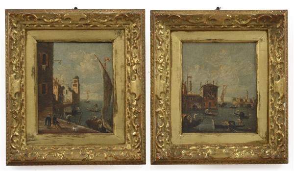 Ignoto "Scorci di Venezia" coppia di dipinti ad olio su tela (cm 20x17) In cornici (difetti)