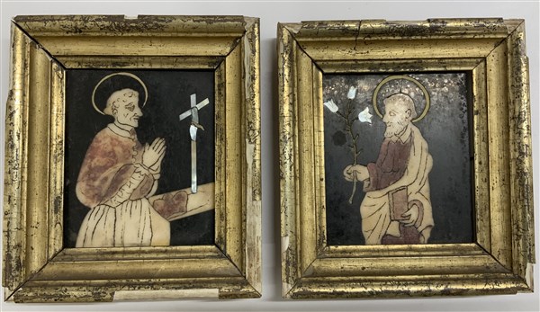 Arte del secolo XIX "Santi"coppia di figure in alabastro e madreperla intarsiati su pietra di paragone (cm 12,5x10) In cornici (difetti)