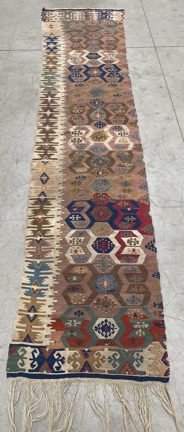 Tappeto Kilim, Anatolia, secolo XIX. Decoro a granchi policromi su fondo rosa,