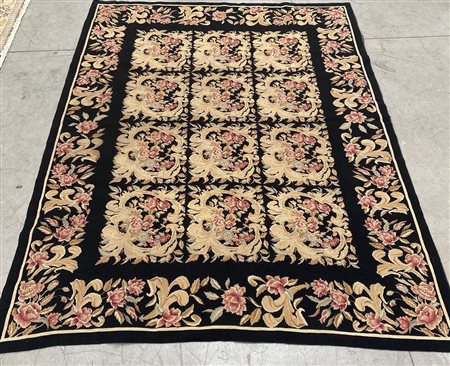 di moderna manifattura. Decoro floreale policromo diviso in riquadri su fondo nero. (cm 222x166)