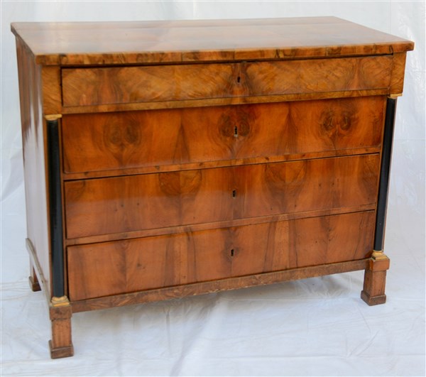 Cassettone lastronato in noce a tre cassetti e mezzo con montanti a mezza colonna ebanizzata con capitelli dorati. Secolo XIX (cm 122x96x60) (difetti)