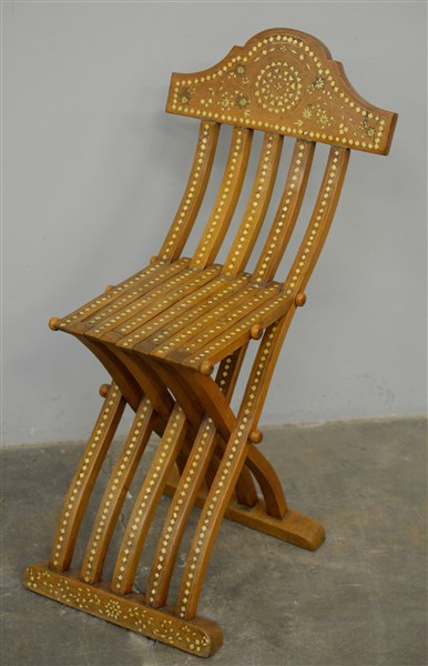 Sedia pieghevole con schienale sagomato, intarsiata in avorio e osso alla "Cert