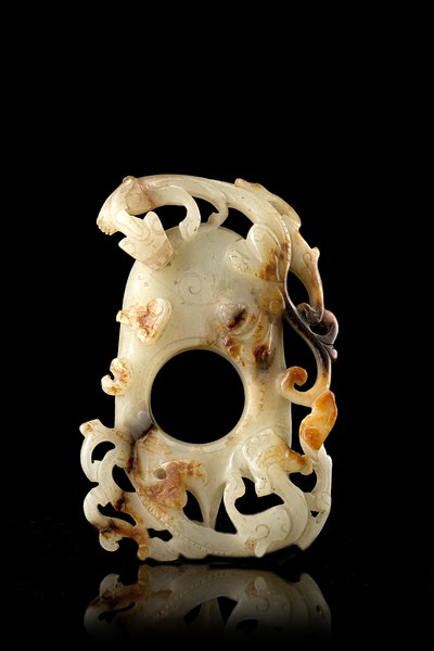 A celadon and russet jade plaque with incised decoration of archaistic dragons and ritual tablet