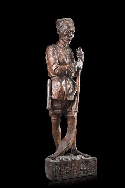 Scultura in legno 'nanmu' raffigurante raffigurante contadino con falce, vestit